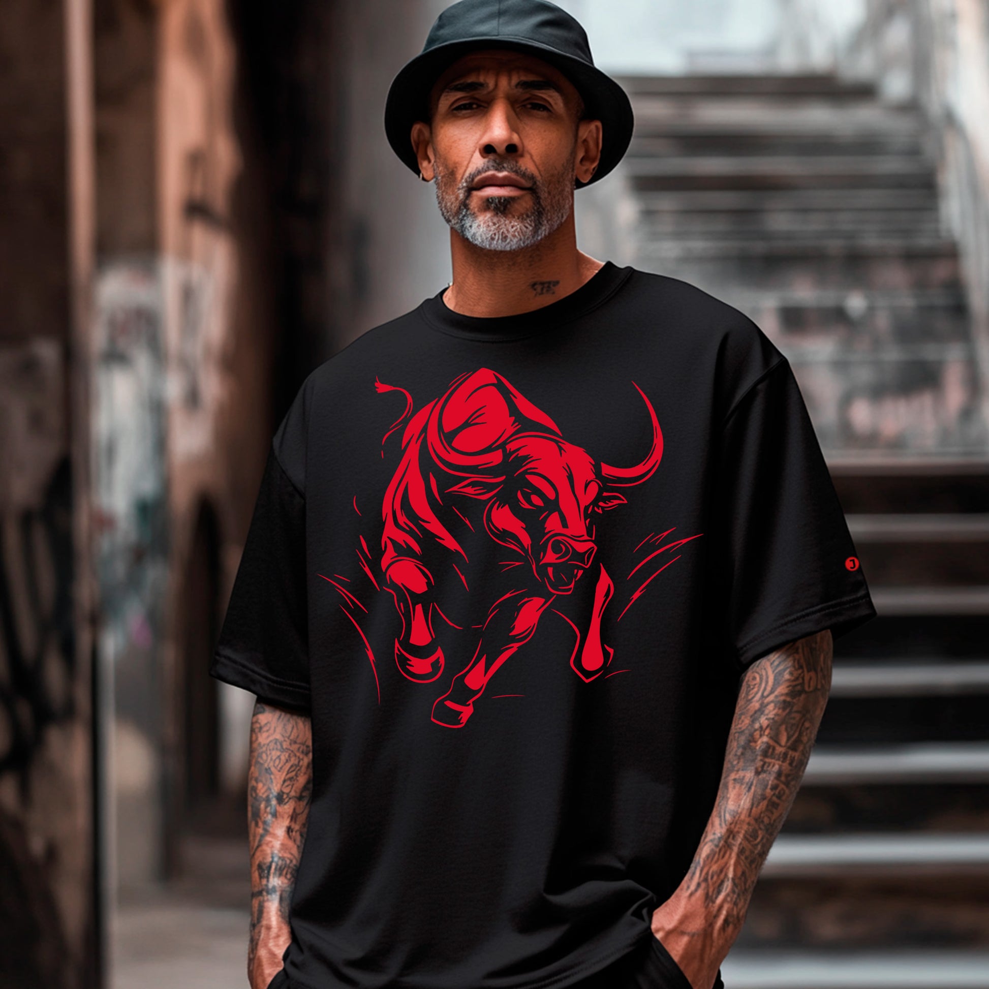 All power, no filler. Bloodrush hits hard with a razor-lined charging bull rendered in deep red across the chest. Printed crisp on dense 7 oz cotton, this boxy heavyweight tee drops clean over the shoulders with that relaxed, modern streetwear drape. The reinforced rib collar and premium jersey keep their shape through heavy rotation—built for layering, built to last.