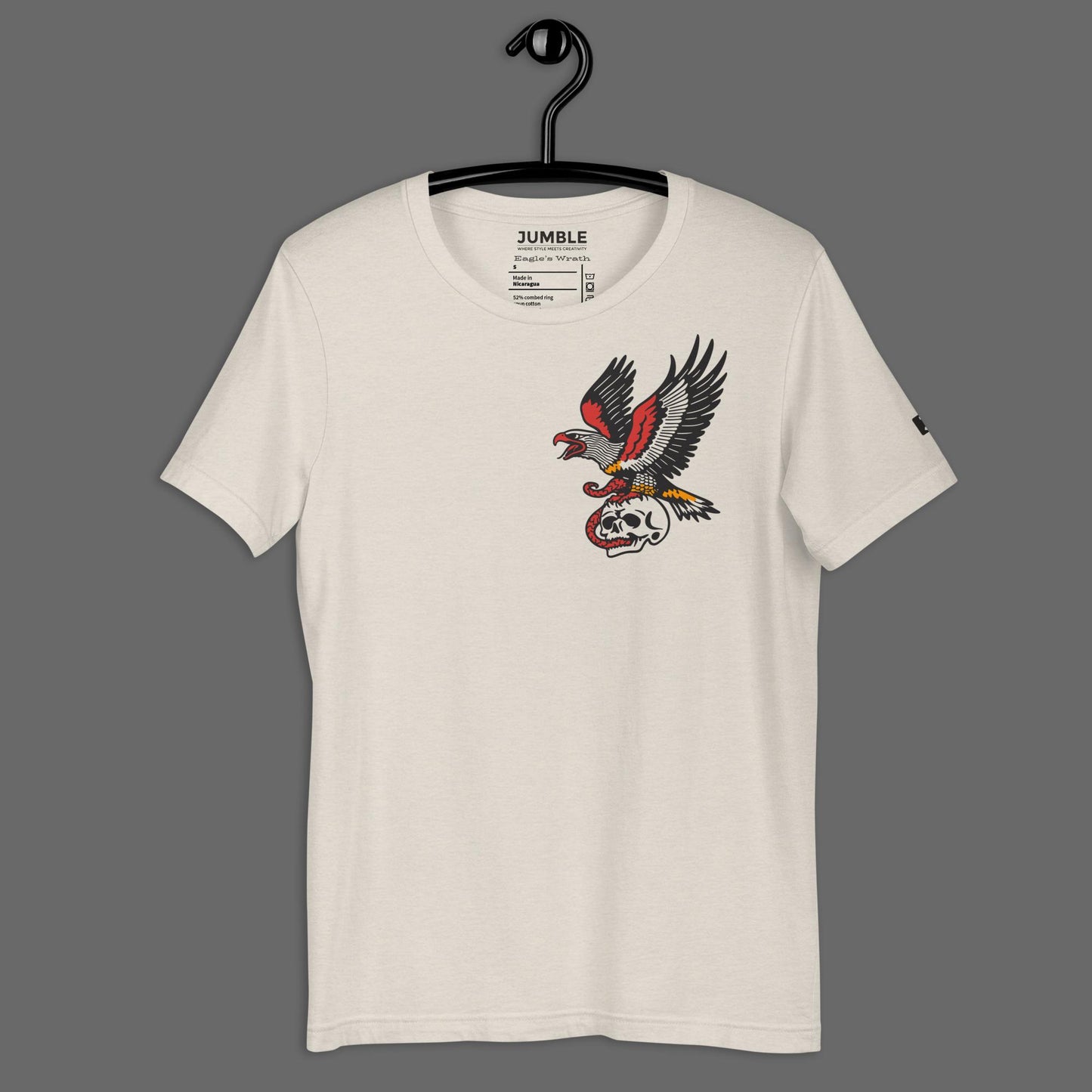 Soar with intensity and bold expression with the Eagle’s Wrath t-shirt, featuring a striking front print of an eagle mid-dive, clutching a skull in its talons. Wrapped around the skull is a coiled snake, embodying strength, resilience, and the fearless spirit of traditional tattoo art. The intricate detailing of the feathers, snake scales, and skull brings this iconic image to life, paying tribute to the legendary Sailor Jerry style. Perfect for those who embrace timeless, rebellious designs, this piece is more than just a t-shirt—it’s a statement.