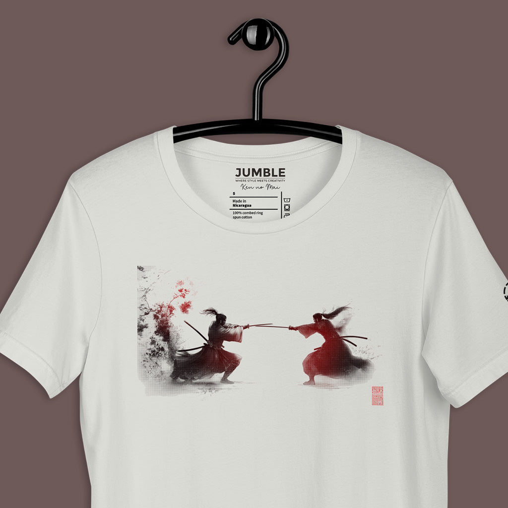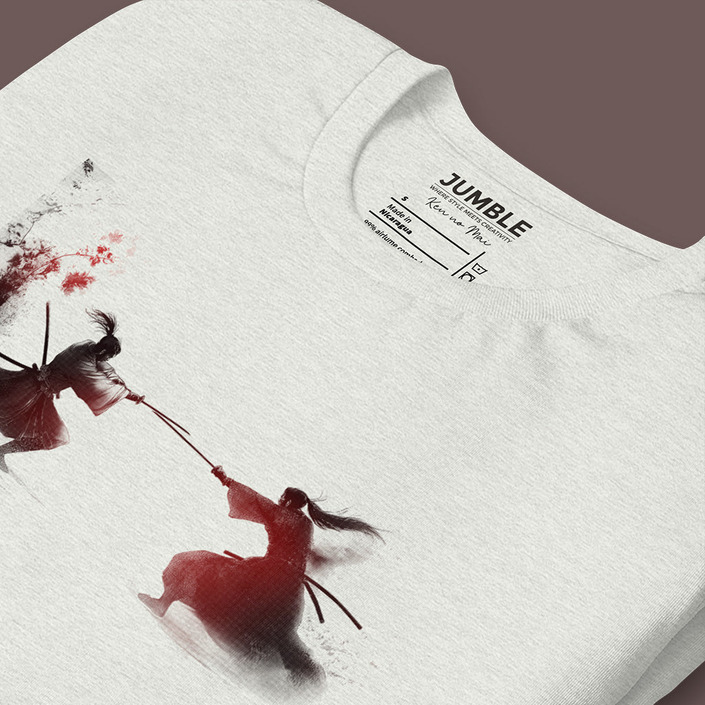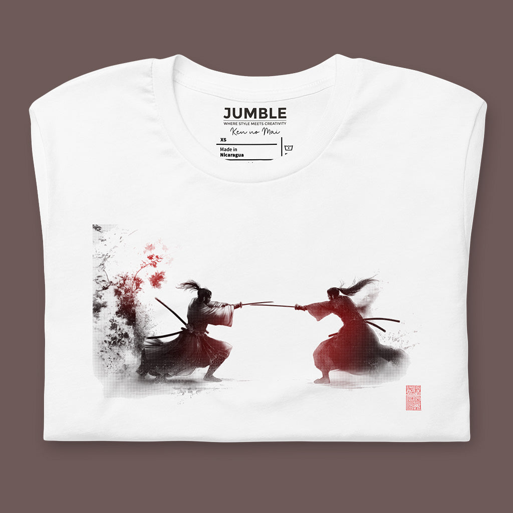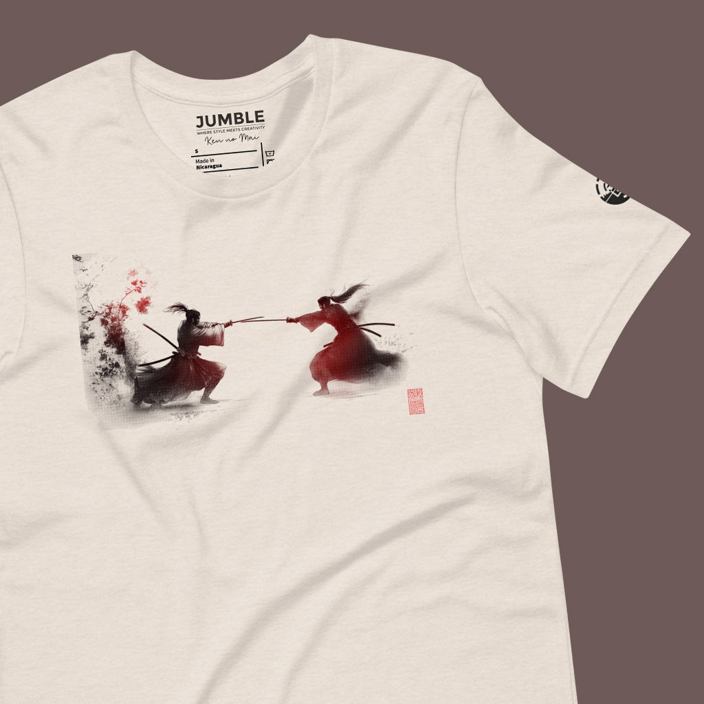 Immerse yourself in the elegance and drama of the Sakura Collection with our "Ken no Mai" (Dance of the Swords) T-shirt. This design captures the fierce beauty of a samurai duel, an homage to traditional Japanese artistry and the cherry blossom's transient beauty.