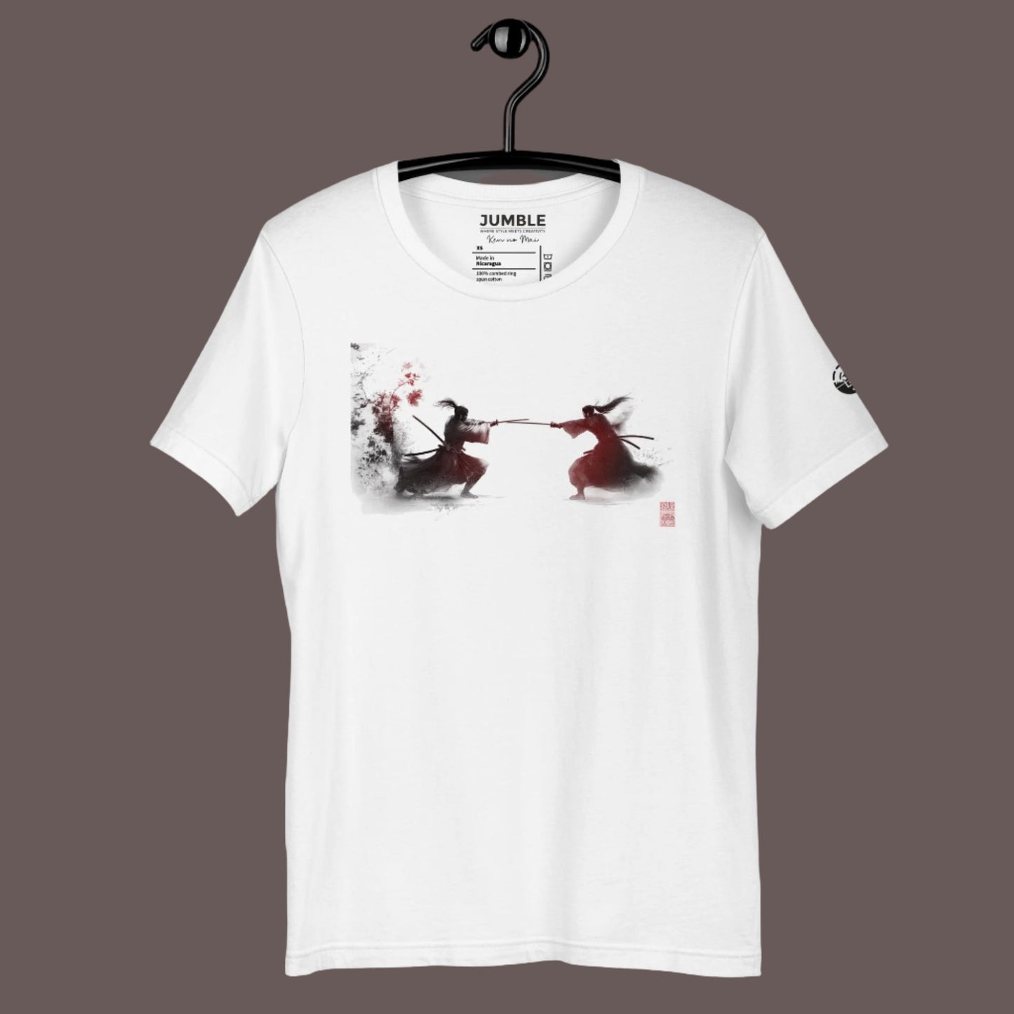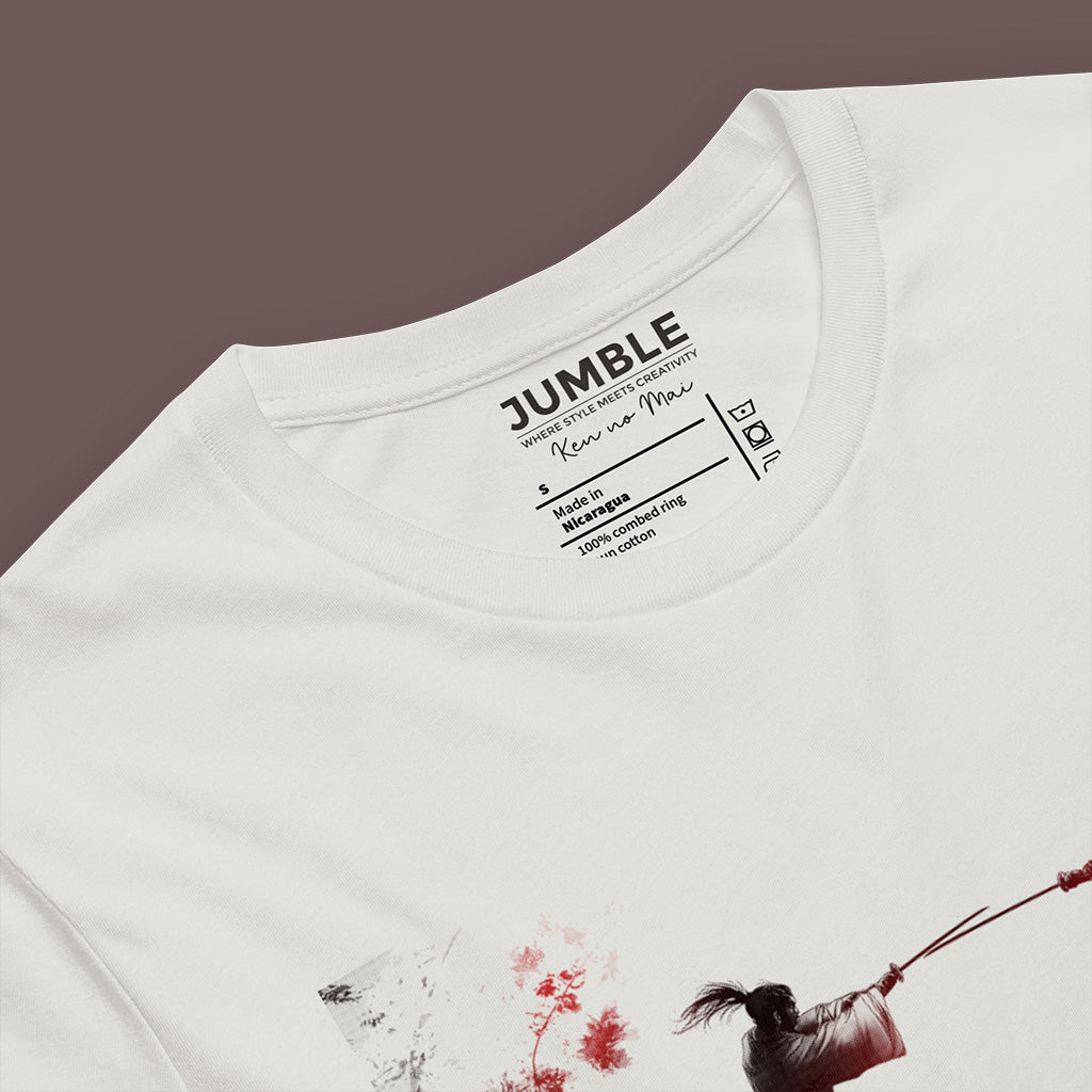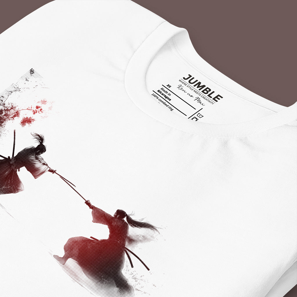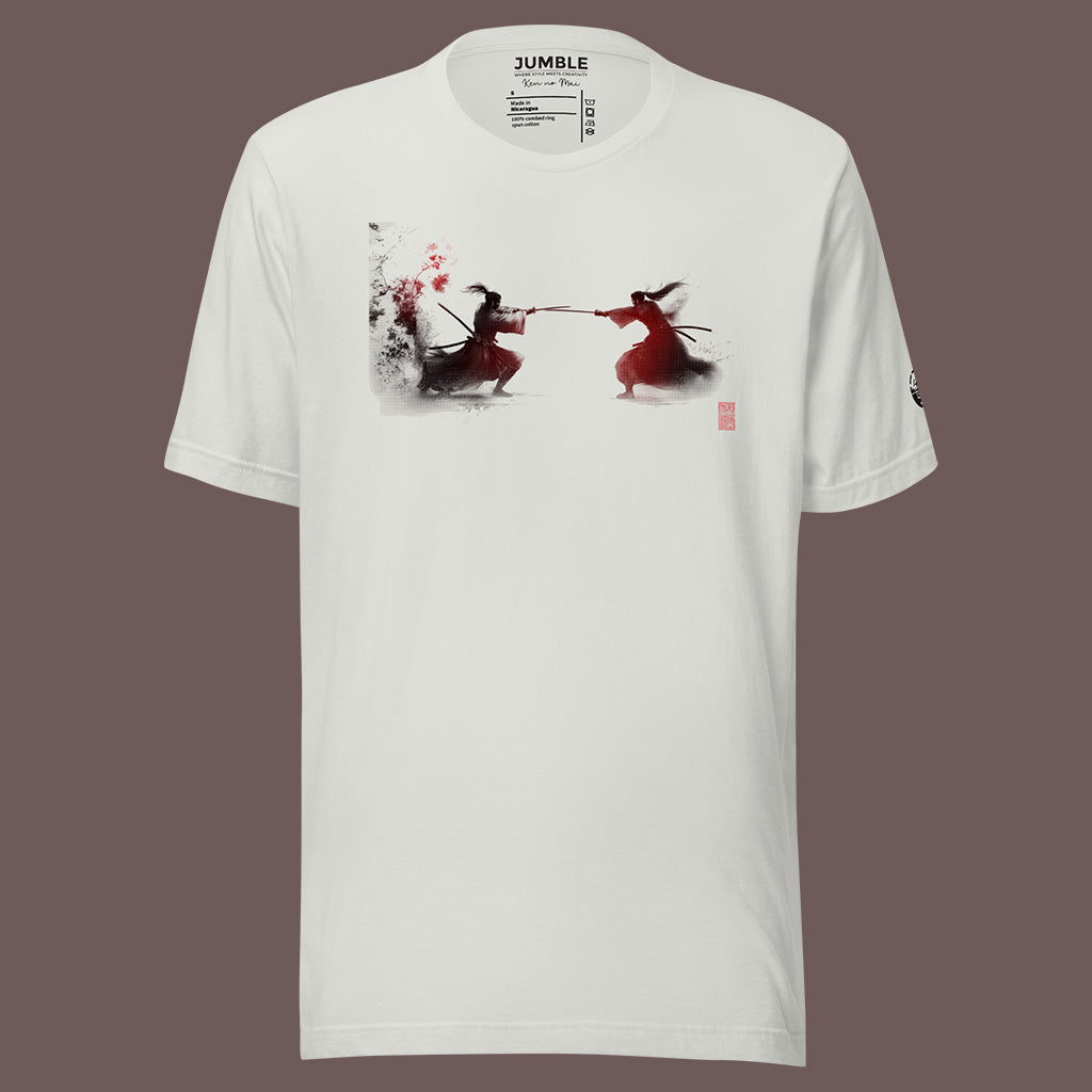 Immerse yourself in the elegance and drama of the Sakura Collection with our "Ken no Mai" (Dance of the Swords) T-shirt. This design captures the fierce beauty of a samurai duel, an homage to traditional Japanese artistry and the cherry blossom's transient beauty.