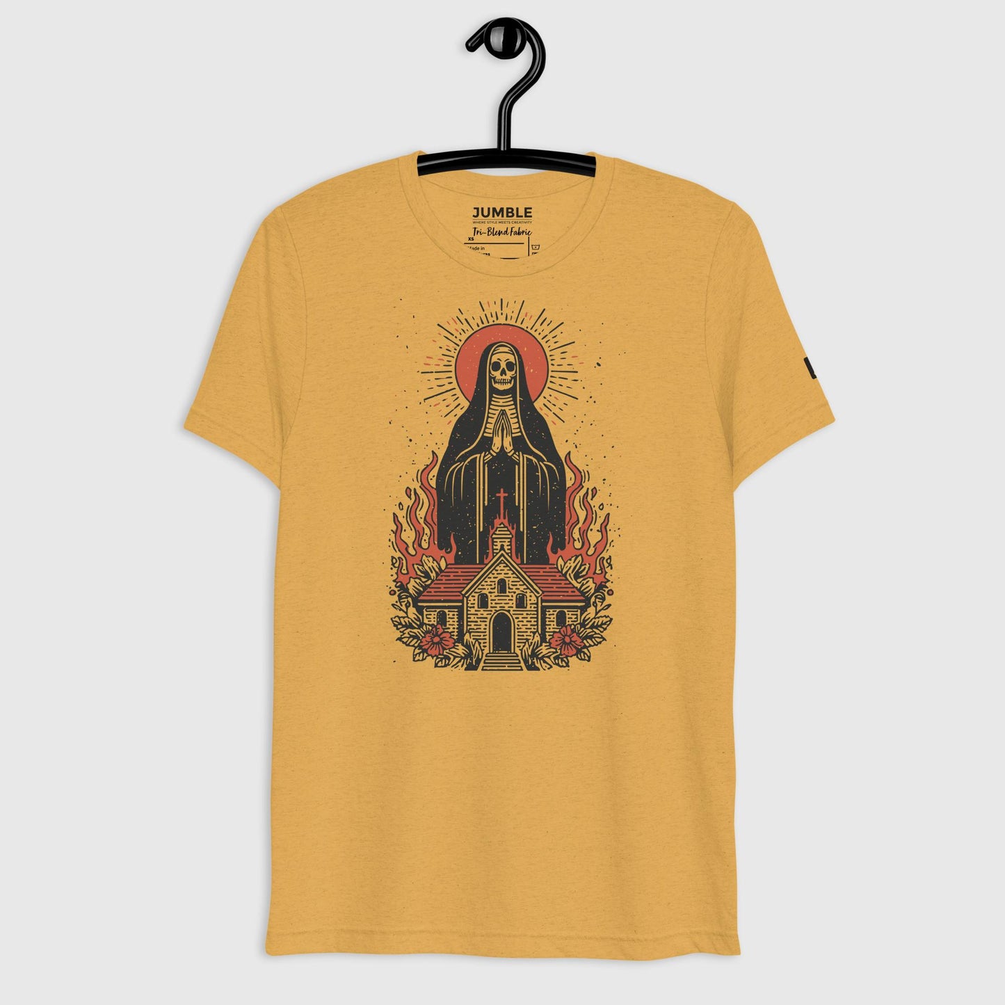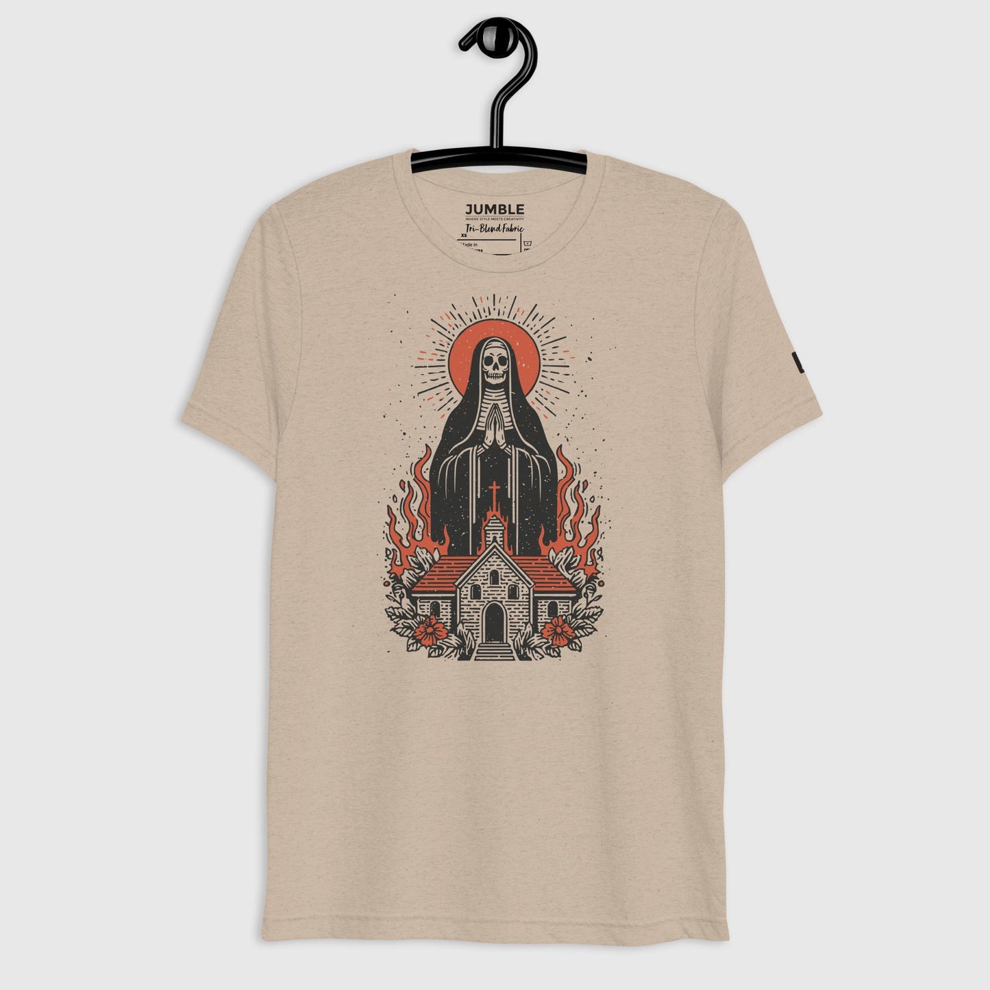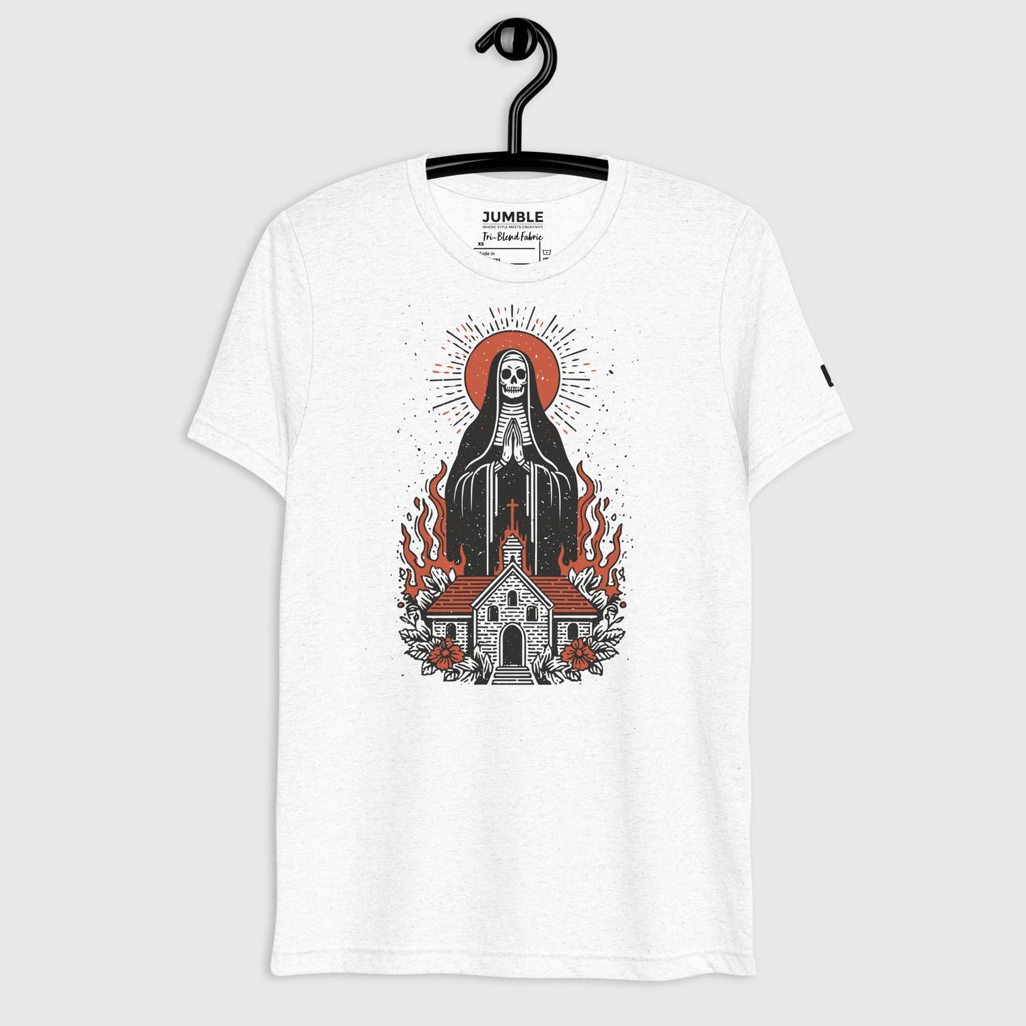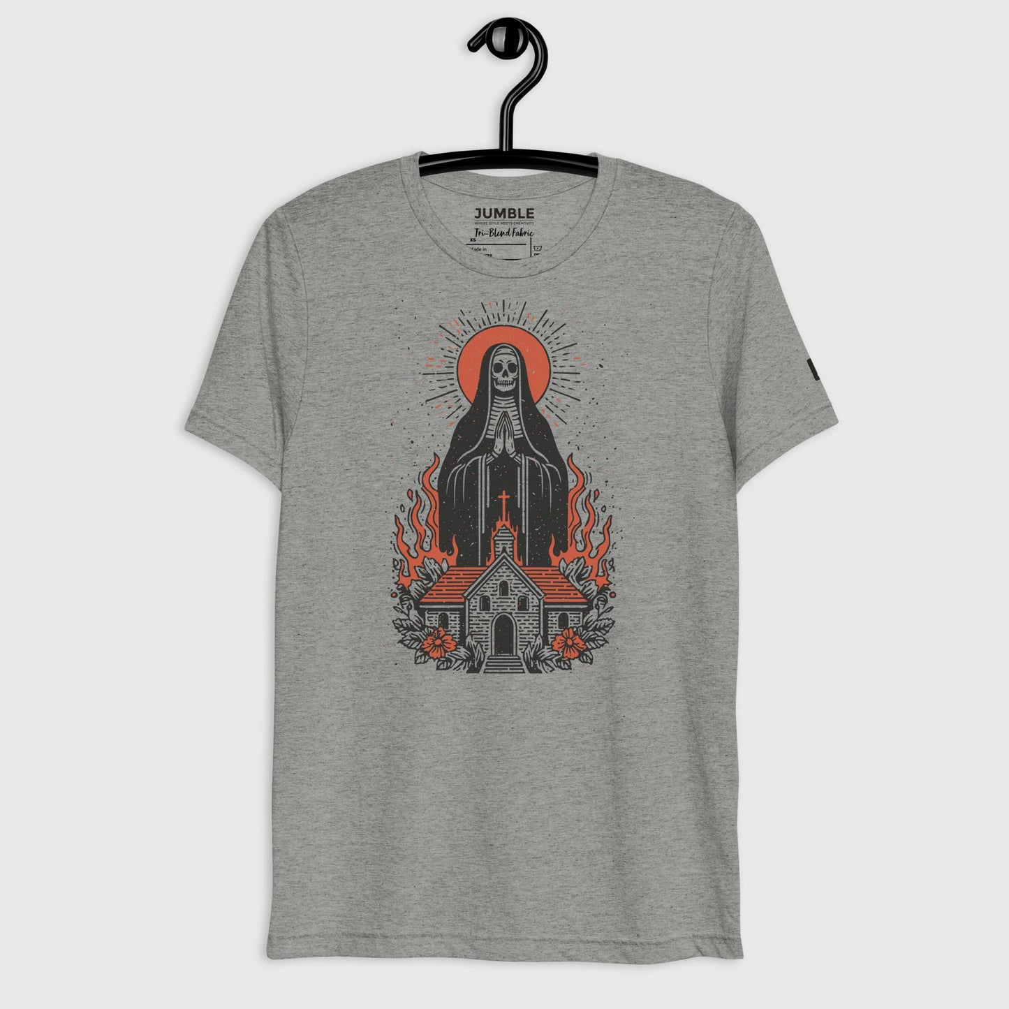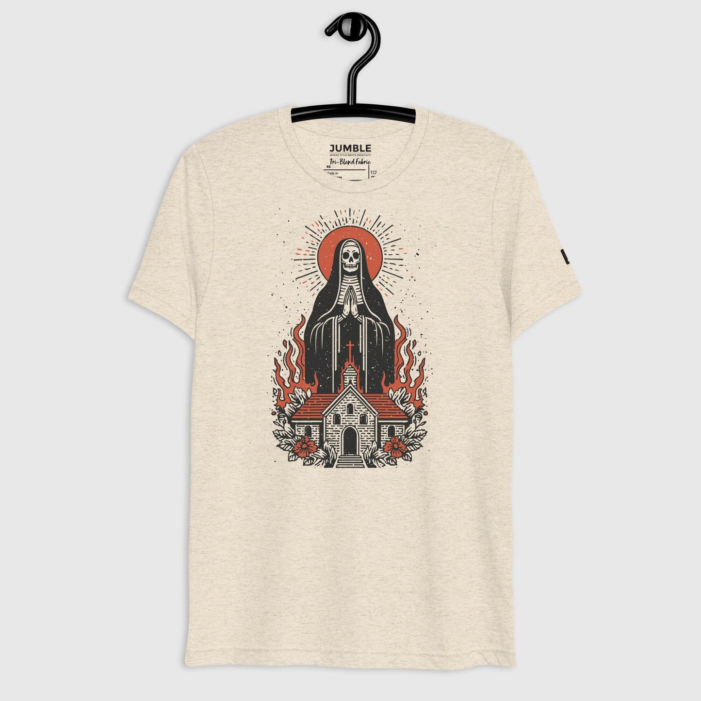 A scene of sacred ruin. The Last Benediction design fuses Gothic dread with artistic detail—an eerie skeletal priest looming over a chapel in flames. Printed on a tri-blend vintage tee that hugs the body with a soft, worn-in feel, this fitted shirt is perfect for those who wear their darkness with style.