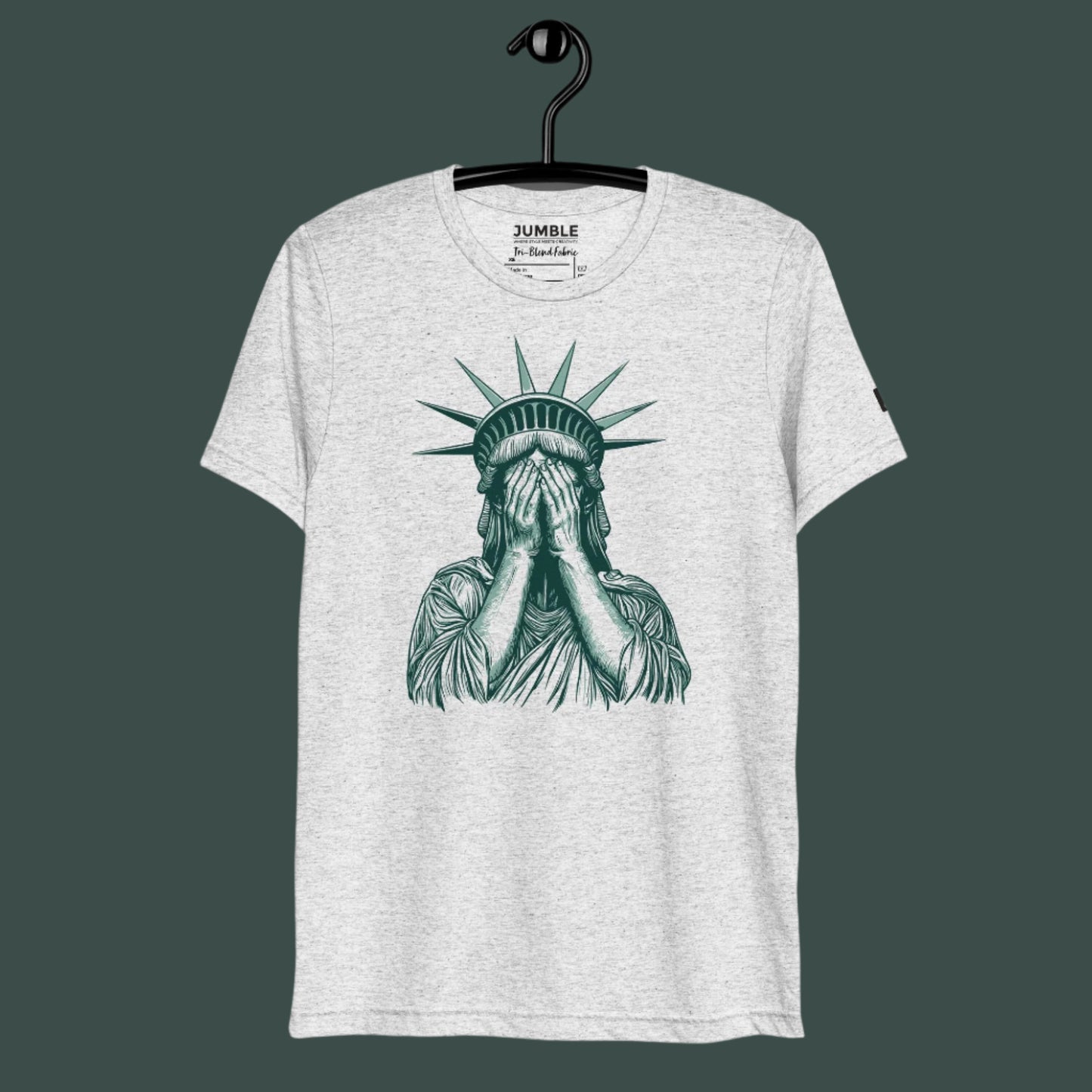 Bold in meaning, vintage in feel—Liberty’s Lament returns in this short sleeve tri-blend tee, pairing one of the most recognizable symbols of freedom with a powerful message of reflection and resistance. The distressed Lady Liberty artwork, hands over her face, becomes even more impactful when printed on this ultra-soft, retro-inspired silhouette.