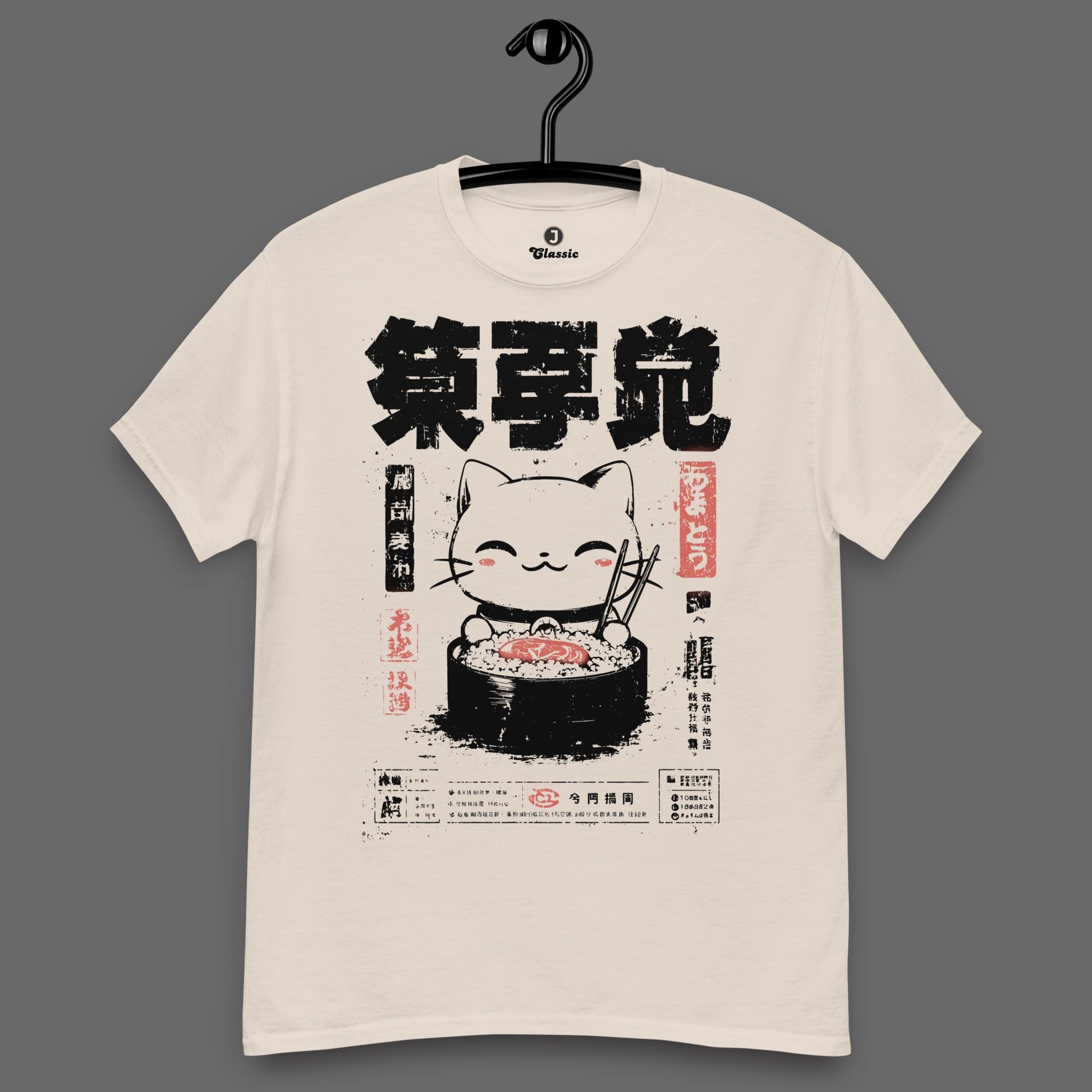 Classic cut, modern mischief. The Shōfuku Sushi tee serves up a clean, structured silhouette with just the right amount of playful weirdness. Front and center: a grinning maneki-neko (lucky cat) perched proudly atop a sushi bowl, surrounded by bold, faux-vintage Japanese type. Whether you’re into old-school poster aesthetics or just want a streetwear-ready design with a side of joy, this one’s on the menu.